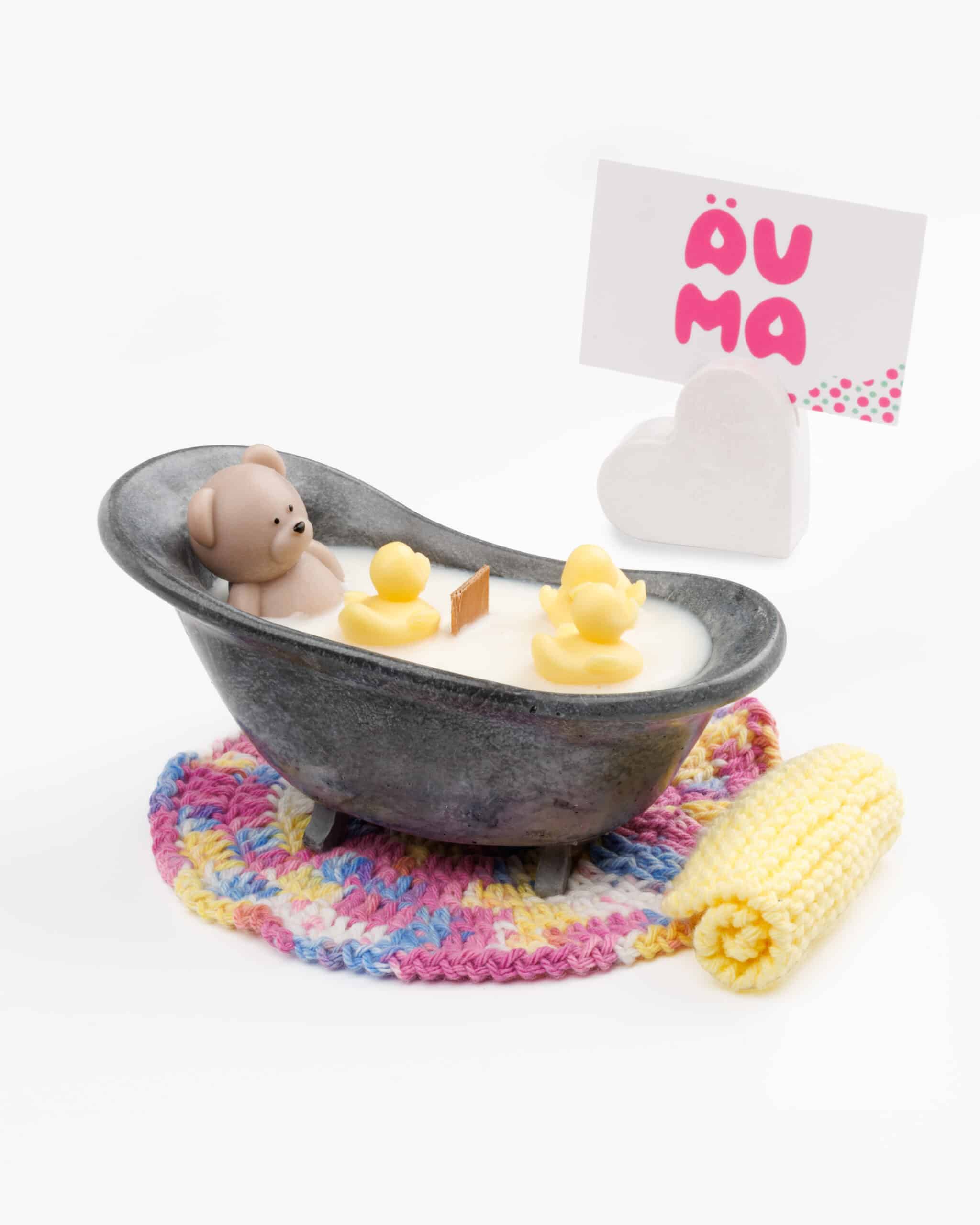 🛁💛 Nuestro osito encontró su momento de relax entre patitos y burbujas de vela. Una pieza única: bañera de cemento + vela de soya que ilumina y decora con ternura. 🧸✨